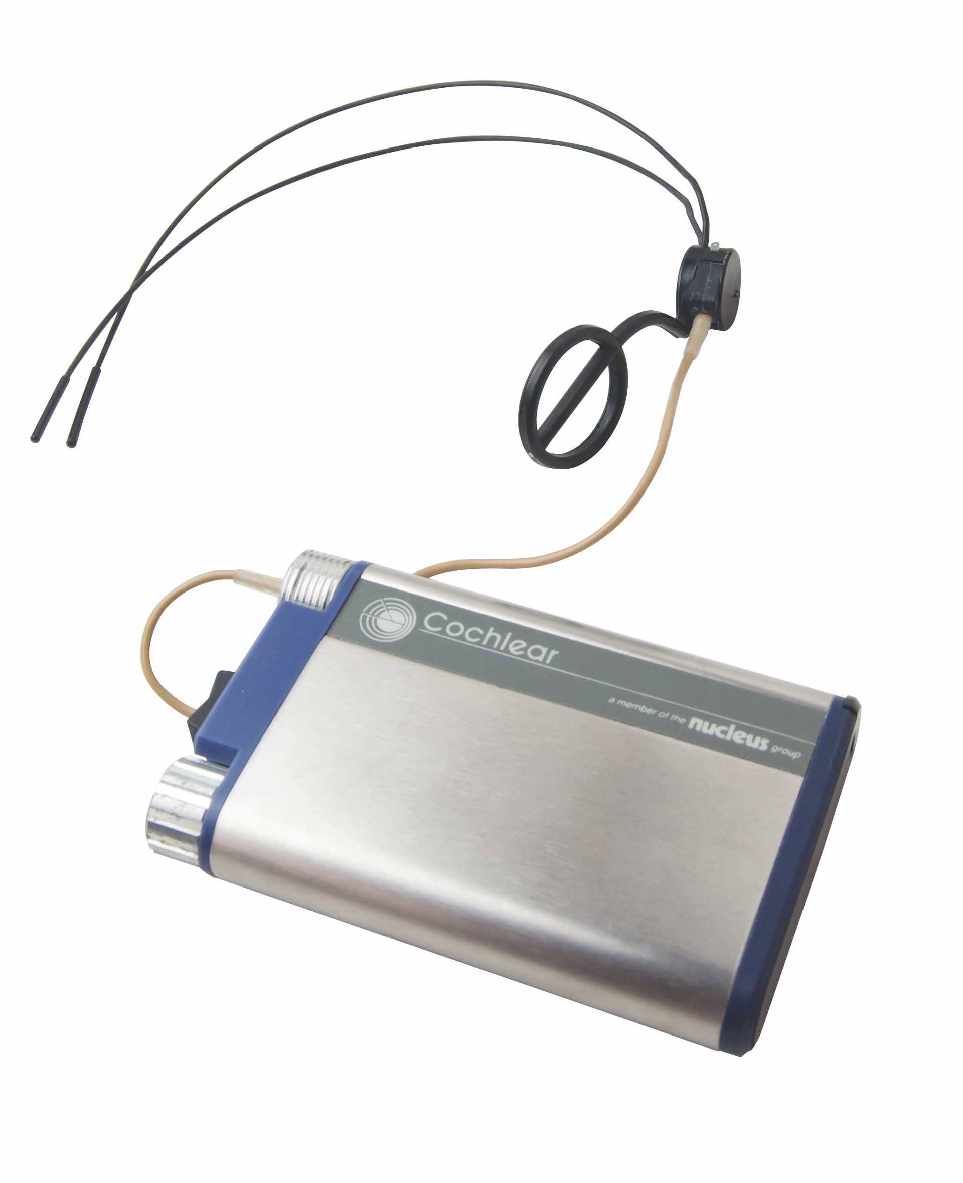 Die Unterschiede sind erheblich. Meinen ersten Soundprozessor musste man am Körper tragen. Er war noch größer als eine Zigarettenschachtel – und deutlich schwerer. Ein langes Kabel verband den Soundprozessor mit der Spule am Kopf. Das Kabel lag über der Kleidung und ich musste aufpassen, dass ich nirgends damit hängenblieb. Die Spule wiederum wurde von einem Kopfbügel gehalten, der mit zwei Streben quer über dem Kopf lag, quasi von einem Ohr zum anderen. Damit die Töne exakt zum Implantat übertragen werden konnten, musste die Spule sehr genau auf dem Implantat liegen. Das Kabel steckte ich nach einiger Zeit immer am Hinterkopf mit einer Haarklammer fest, was auch der Spule Halt gab. Und für den Soundprozessor ließ ich mir eine kleine Tasche mit Tragegurt nähen, sodass ich ihn unter Bluse oder Pullover tragen konnte.
