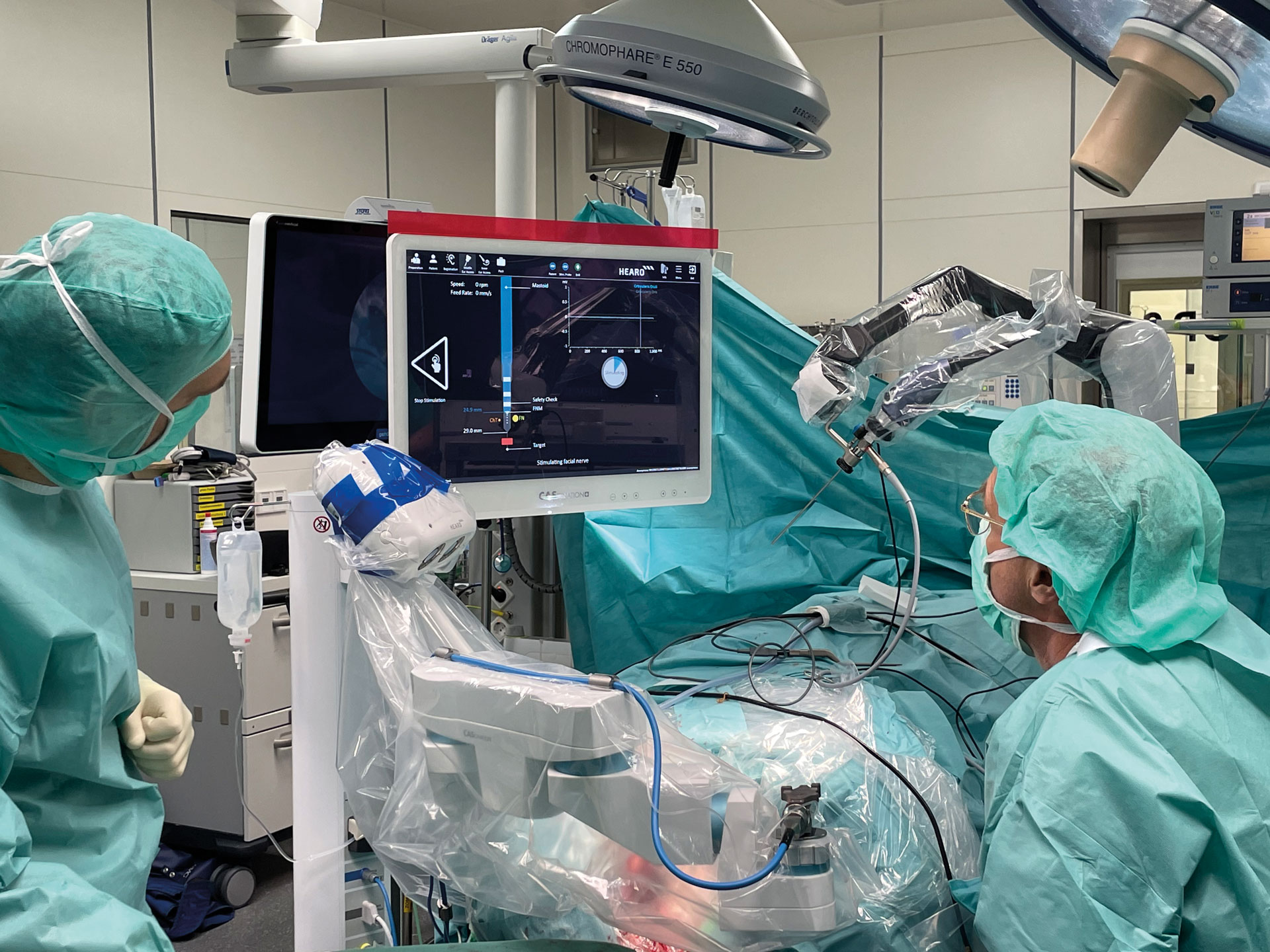 Ermöglicht wurde die roboter-assistierte Bohrung durch eine Technologie namens HEARO. Der entsprechende Roboter wurde von der CAScination AG in Zusammenarbeit mit MED-EL entwickelt und soll künftig weltweit bei Implantationen unterstützen. Bei seinem ersten Einsatz in Deutschland habe er »fast vollautomatisch« unter der Aufsicht von Prof. Klenzner einen zwei Millimeter breiten Kanal durch die Schädeldecke zum Innenohr gebohrt. Aber auch darüber hinaus werde die Technik von Nutzen sein. »HEARO ermöglicht eine individuelle, sehr detaillierte Vorplanung und Einschätzung des operativen Zugangs zum Innenohr. Der Roboter führt selbstständig hochpräzise die vom Operateur festgelegte Bohrung von der Knochenoberfläche zur Hörschnecke im für den Patienten idealen Winkel durch. Der Operateur gibt dabei die Bohrung frei und überwacht sie auf verschiedenen Ebenen, z. B. mit einer speziellen Röntgentechnik und einem permanenten Monitoring des Gesichtsnervs. Nachdem der Zugang zur Hörschnecke geschaffen wurde, eröffnet der Operateur die Hörschnecke und führt die Elektrode manuell langsam und schonend ein, geführt durch eine Hülse im Bohrkanal«, so Prof. Klenzner. Damit würde man Chirurgen helfen, sowohl einen minimal invasiven Zugang zur Cochlea zu ermöglichen als auch einen idealen Weg zur Einführung des Elektrodenträgers in die Cochlea zu bahnen. Zudem ließe sich so das Restgehör noch besser schonen, und auch die Liegezeiten könnten so verkürzt werden.