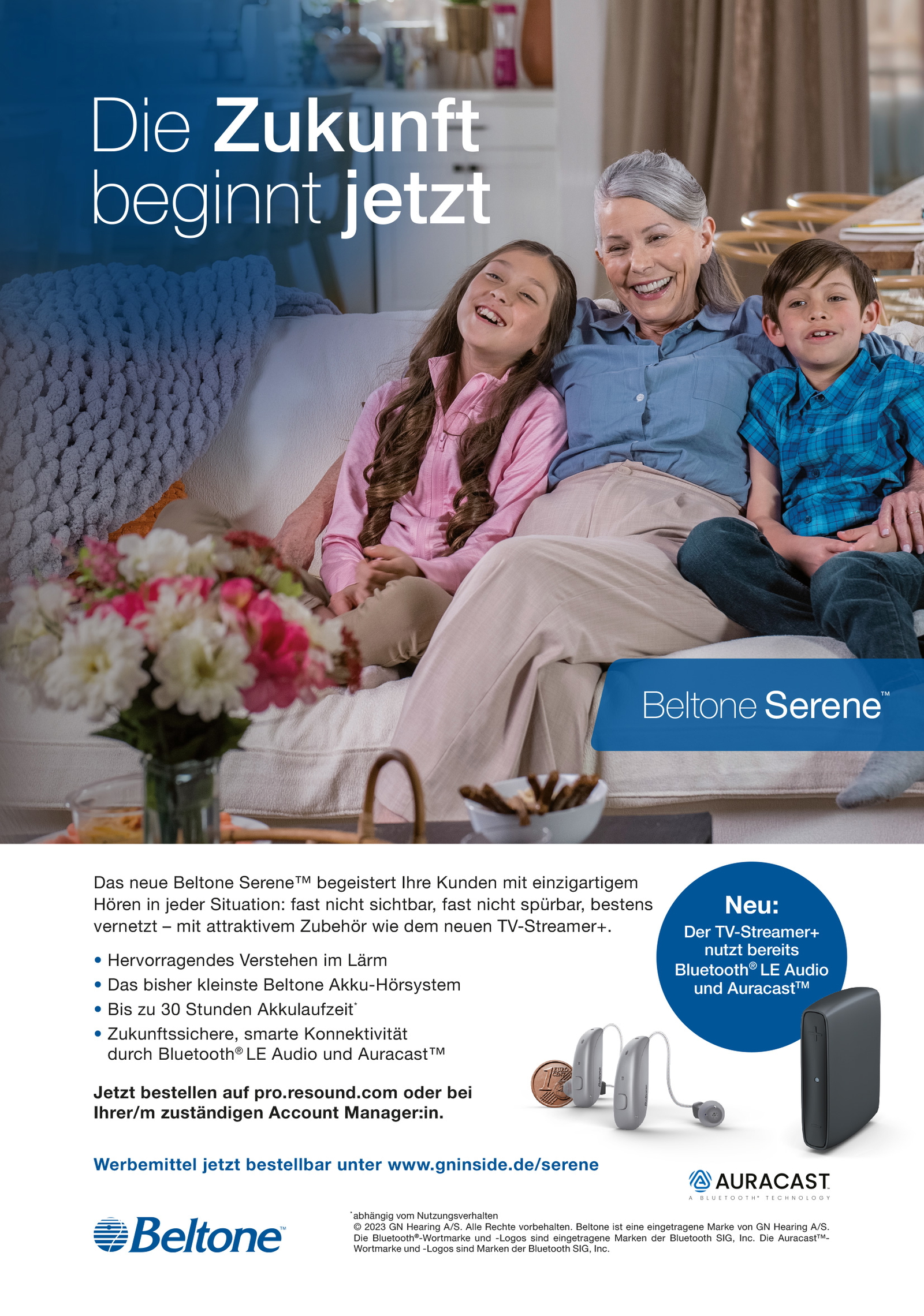 »Mit Beltone Serene sowie mit den vielfältigen Anbindungsoptionen inklusive des TV-Streamer+ bieten wir dem regionalen Hörakustik-Fachhandel ein äußerst attraktives Paket«, so Christian Lücke, Geschäftsführer DACH der GN Hearing GmbH. »Dieses Spitzen-Hörsystem verfügt über wegweisende Technologien für natürlichen Klang und außergewöhnliches Sprachverstehen. Selbst in herausfordernden akustischen Umgebungen können sich die Nutzer jederzeit selbstsicher bewegen; sie verlieren nie den Kontakt zu ihrem Umfeld. Neben diesen Nutzervorteilen steht die Exklusivität der Marke Beltone, mit der wir regionale Partner unterstützen. Die Marke liefert ihnen ein extrem starkes Argument, mit dem sie sich im Wettbewerb vor Ort behaupten können.«