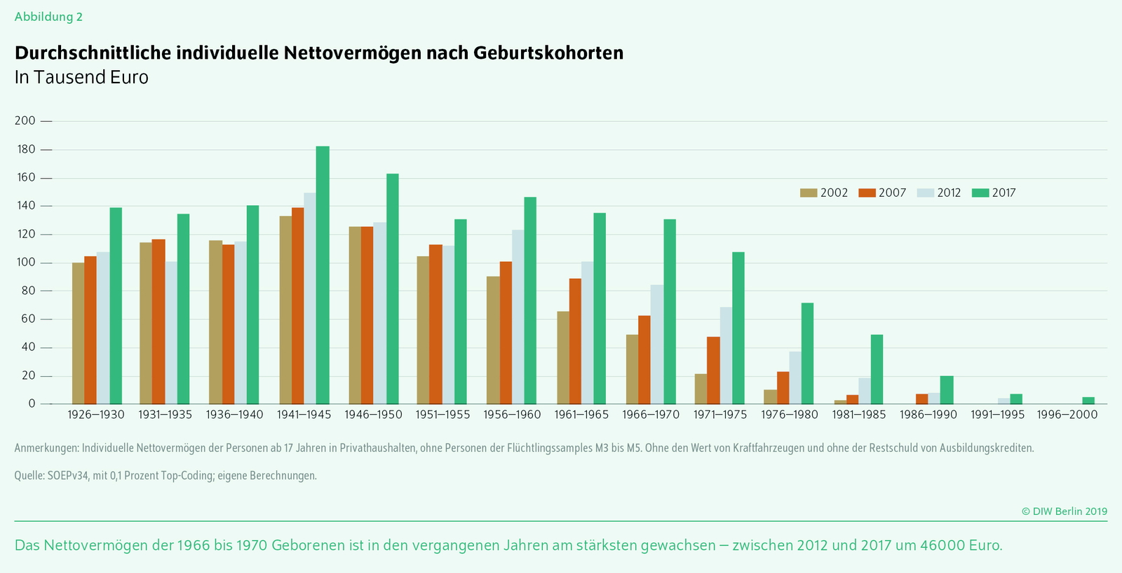 Natürlich muss man bei einem Vergleich der Vermögensbestände nach Geburtskohorten ein deutliches Lebenszyklusmuster bedenken. Denn bis zu einem Alter von 25 Jahren verfügen junge Erwachsene (bis nach der Ausbildungsphase) lediglich über sehr geringes oder gar kein Vermögen. Dies ändert sich dann mit zunehmendem Lebensalter deutlich. Entsprechend lag dem DIW zufolge das durchschnittliche Nettovermögen eines Babyboomers 2017 durchschnittlich bei etwas mehr als 140.000€. Nach der Geburtskohorte der zwischen 1966 und 1970 Geborenen, die zwischen 2012 und 2017 mit 46.000 Euro den größten Vermögenszuwachs erzielten, folgten bereits die Babyboomer, die zwischen 1960 und 1964 geboren wurden. Auch sollte in diesem Zusammenhang erwähnt sein, dass mit dem Übergang in die Rentenphase das Vermögen leicht zurückgeht, da Lebensversicherungen ausgezahlt und Vermögen verzehrt werden, um das wegfallende Erwerbseinkommen zu kompensieren, bevor dann die Wahrscheinlichkeit von Erbschaften oder Schenkungen steigt.13
