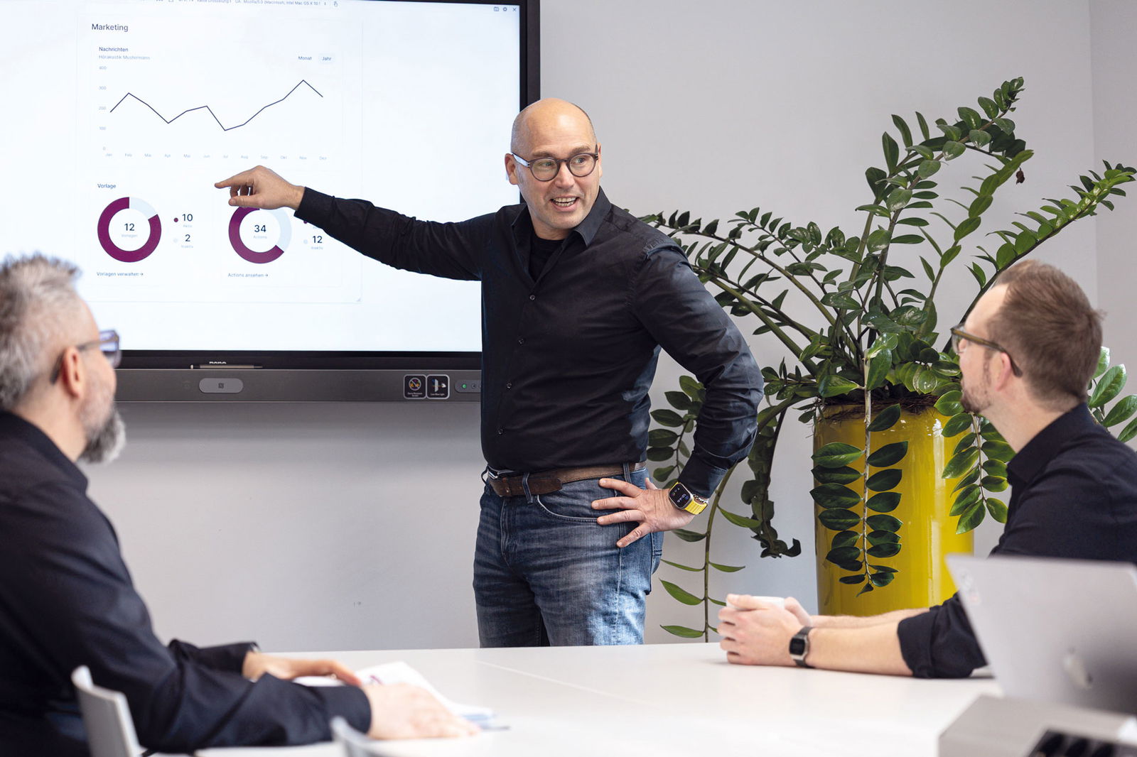 »KI gehört zur Zukunft. Aber es muss klar sein, welchen Service die KI bearbeiten kann und welcher nach wie vor den Menschen braucht« – Thomas Häusler, Hardy Türling und Michael Becker (von li. nach re.) bei einem Planungsmeeting