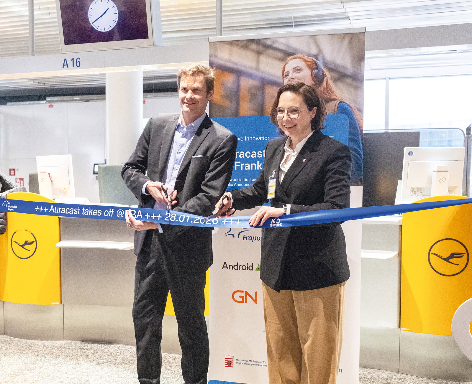 Der Flughafen Frankfurt hat an zwei Gates feierlich Auracast-Anlagen in Betrieb genommen – vorerst testweise