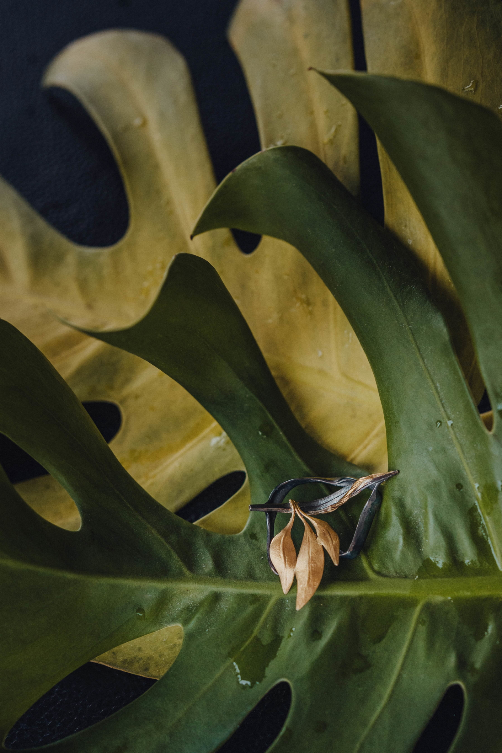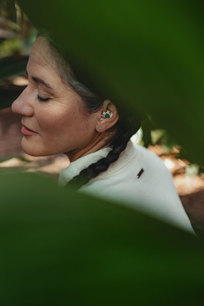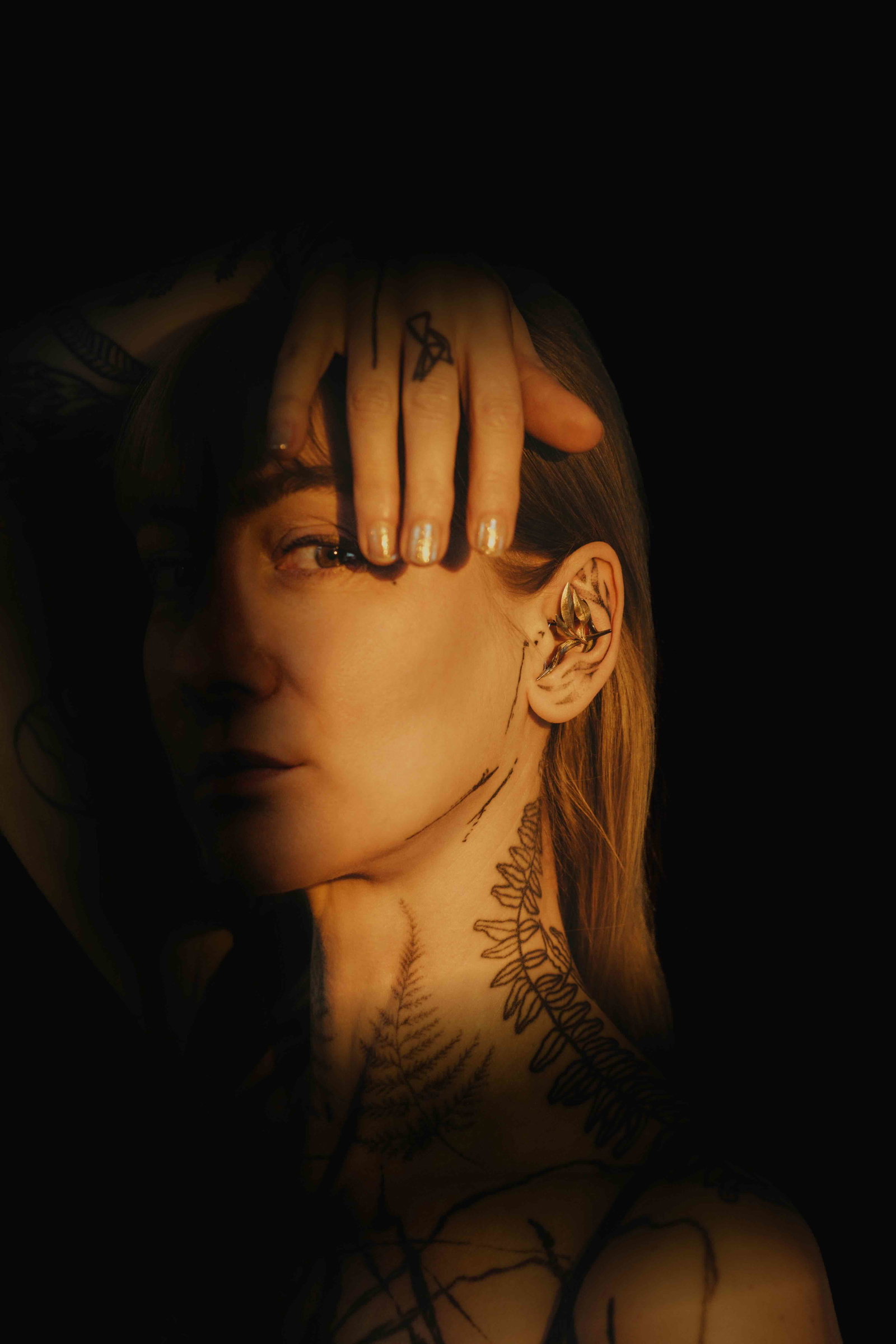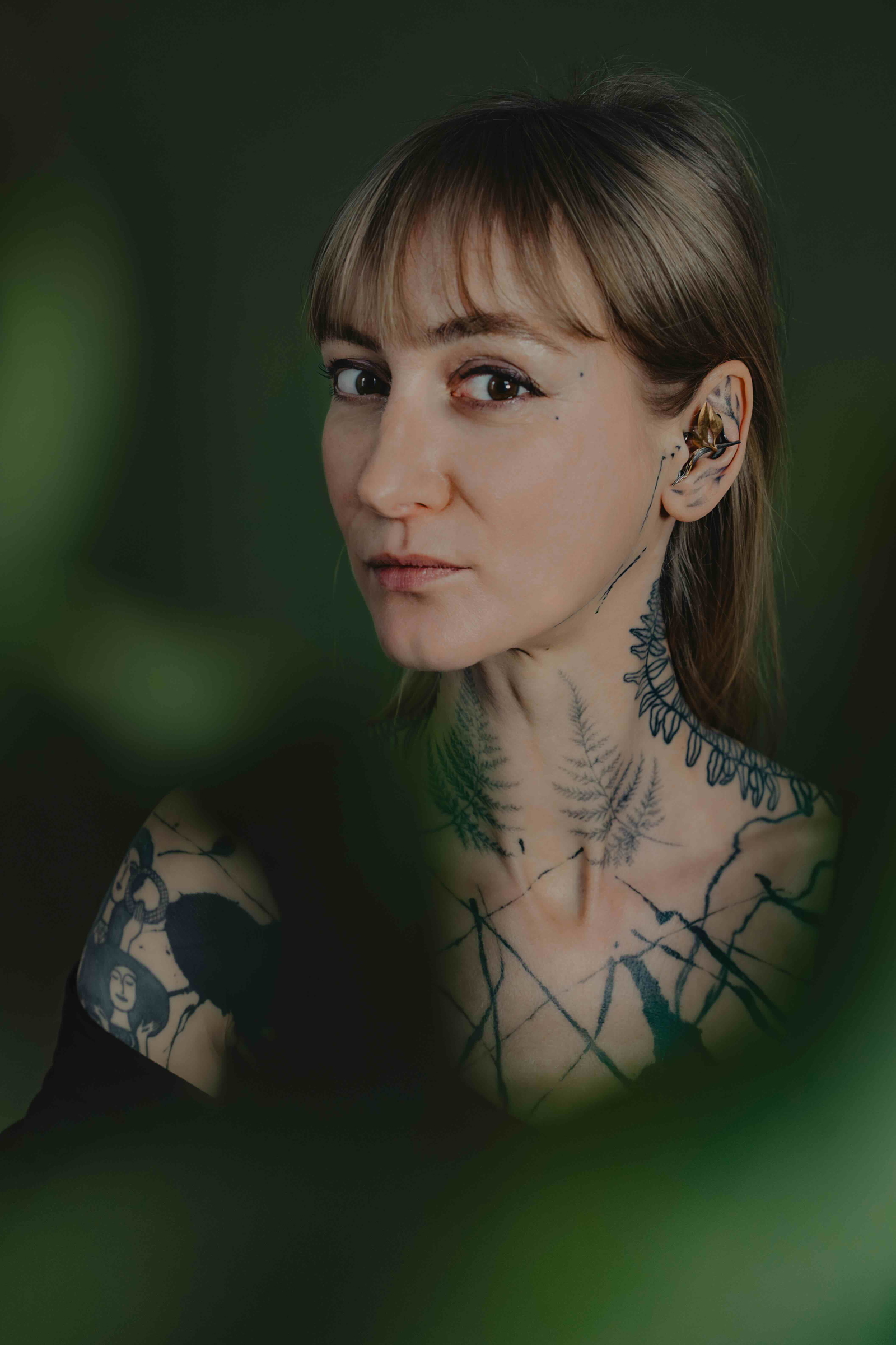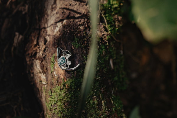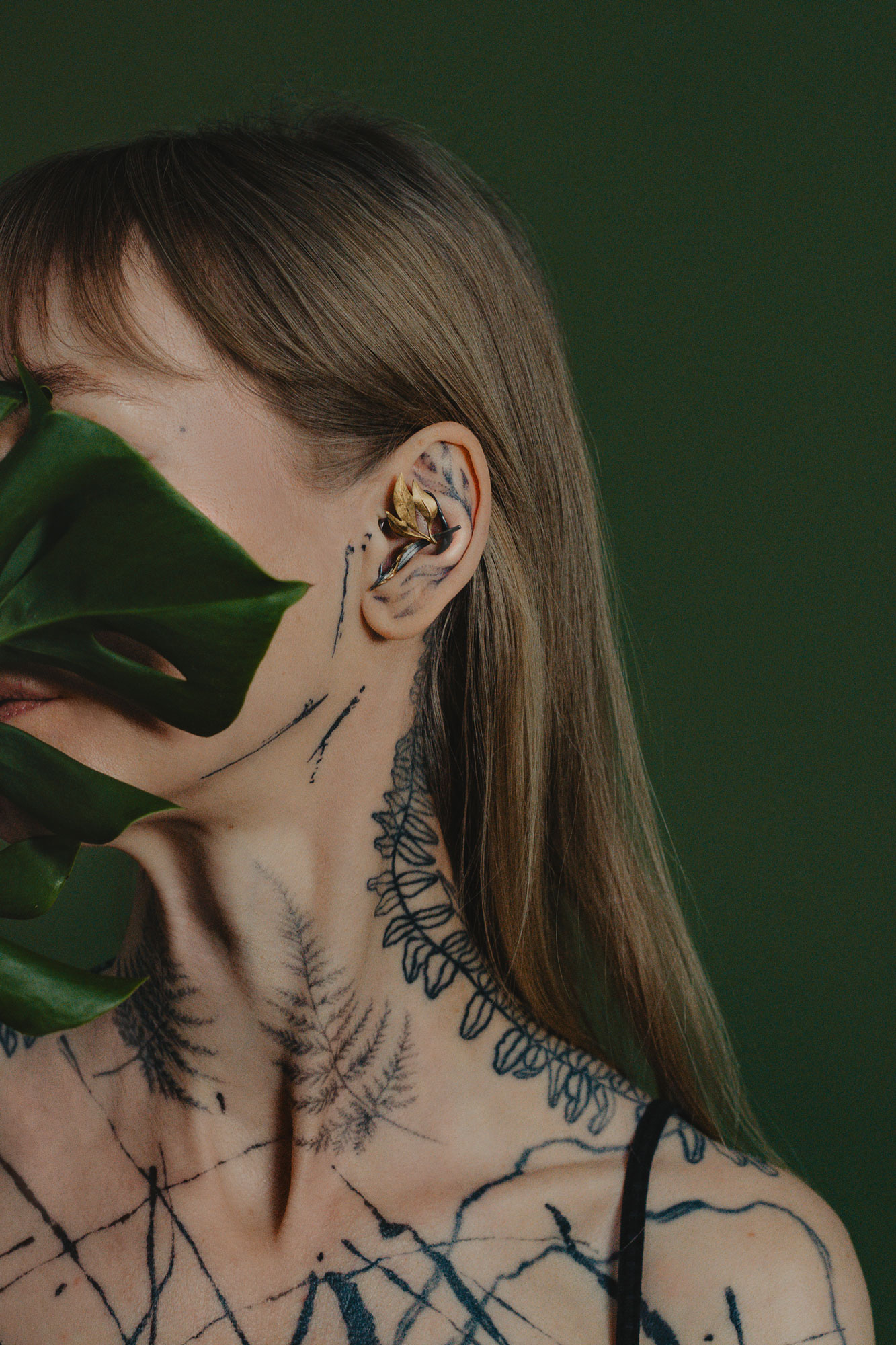 Beispielsweise habe ich ein MORELI für eine Tätowiererin kreiert, die selbst ein Gesamtkunstwerk darstellt, da sie selbst – samt Ohr – ganzkörpertätowiert ist. Ich habe ihre florale Motivsprache und ihr Thema so aufgenommen, dass die Linienführung des MORELI parallel zu den Strichmustern auf ihrer Haut stattfindet. Und da das Thema Amore immer wieder dabei auftaucht, habe ich für sie Myrte-Blätter modelliert – seit jeher ein Symbol für wilde Liebe – und das Ganze in geschwärztem Silber mit punktuellen Vergoldungen umgesetzt. Die Blätter ranken sich nun plastisch aus ihrem tätowierten Ohr heraus.